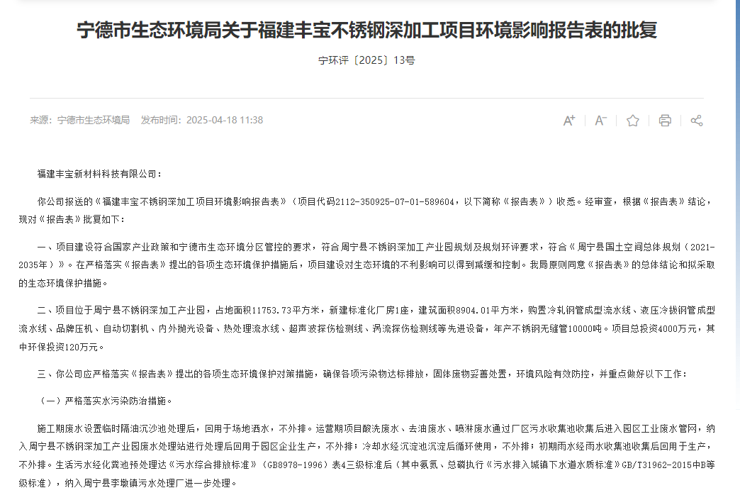 福建豐寶不銹鋼深加工項(xiàng)目環(huán)評(píng)獲同意通過(guò)
