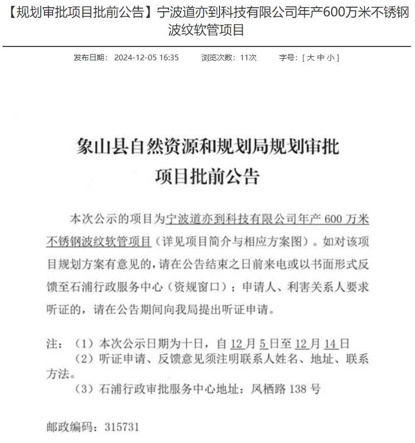 寧波道亦到年產(chǎn)600萬(wàn)米不銹鋼波紋軟管項(xiàng)目規(guī)劃審批項(xiàng)目獲批前公告